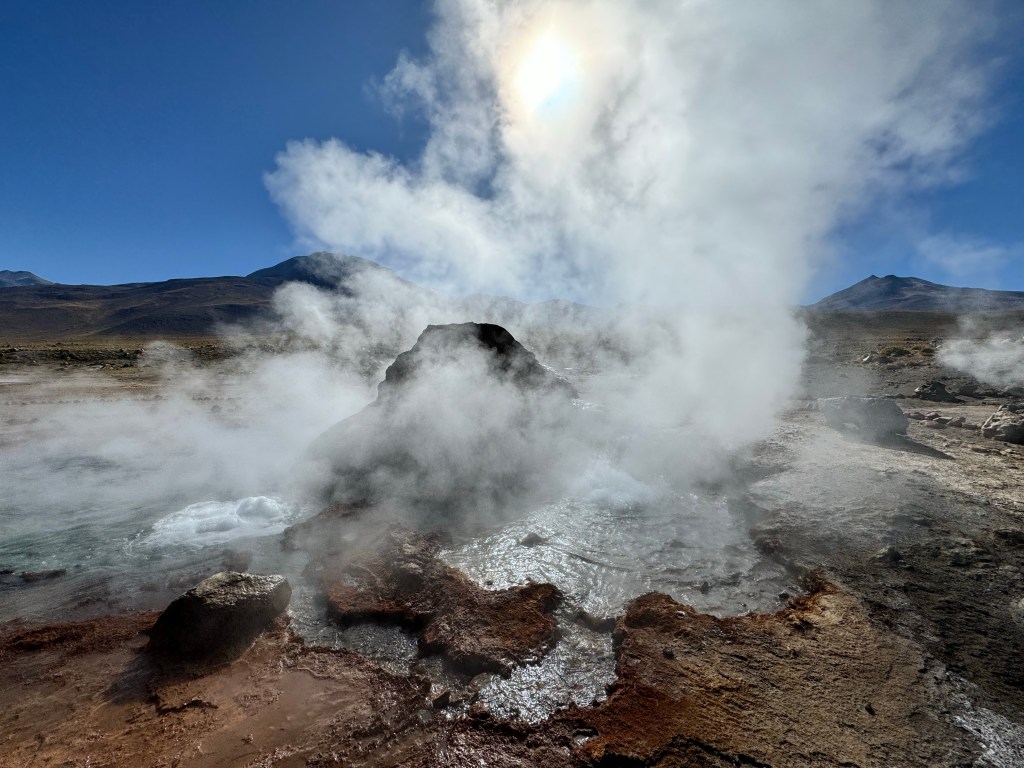 Auf unserer Fahrt zum Ausgangspunkt für unsere dreistündige Wanderung zum Volcano blanco machten wir bei den weltberühmten, Millionen Jahre alten Geysiren del Tatio Halt. Als ich dort stand, das Blubblern hörte sowie den Dampf, die Farben und die Landschaft wahrnahm, kriegte ich Gänsehaut. Gewaltig, was Mutter Erde geschaffen hat! Wie munzig klein ist da der Mensch, der hier steht.