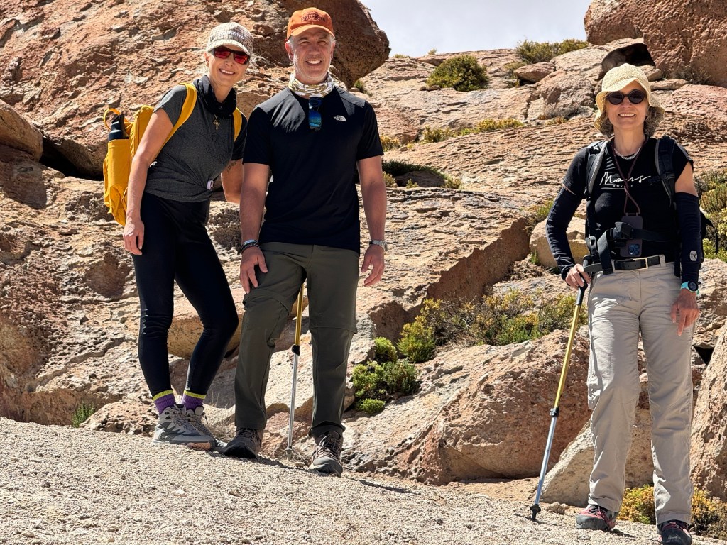 Auf einer Höhe von 4000 bis 4500 Metern wandert es sich deutlich langsamer als gewohnt. Die dreistündige Tour zum Volcano blanco mit vielen Trinkpausen bot uns wiederum sehr viel Abwechslung: Blubbernde und dampfende Geysire, durch eine spektakuläre Schlucht mit einer reichen Tierwelt und einer zum Teil bizarren Fluss- und Sumpflandschaft in den verschiedensten Farben, bis zu rot. Ein Teil des Wassers ist sauber und trinkbar, der andere ist hoch toxisch (u.a. Arsen) – und zwar nicht wegen irgendwelcher Chemie, sondern aus einer Laune der Natur. Wir konnten unzählige Guanacos beobachten, Vizachas (eine Art Kaninchen mit langem Schwanz), Flamingos und andere Vogelarten sowie Pflanzen, unter anderem eine Alpenbrennessel mit schönen weissen Blüten, die zwar beim Berühren der Blätter brennen soll, aber aus welcher – im Gegensatz zu den Schweizer Brennnesseln – kein Tee gewonnen werden kann.