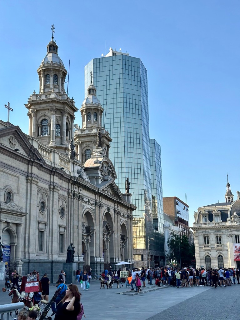 Der gestrige, zweistündige Flug von Calama nach Santiago war angenehm. Etwas nach 17 Uhr landeten wir in der chilenischen Hauptstadt, checkten im Hotel ein und bereits kurz nach 18 Uhr nahmen wir uns ein Taxi, um in die Innenstadt zu fahren. Der junge Taxifahrer merkte sofort, dass diese zwei Oldies aus Europa Greenhorns sind 😉 und bot uns an, uns die Stadt zu zeigen, was wir dankend annahmen. Denn mit dem Einbrechen der Nacht werde es an zahlreichen Orten – vor allem auf und um den berühmten Plaza de Armas – gefährlich. Die Läden schliessen um 20 Uhr. Nach 19 Uhr leeren sich die Gassen in diesem Quartier, selbst die Polizei sei nicht mehr präsent.