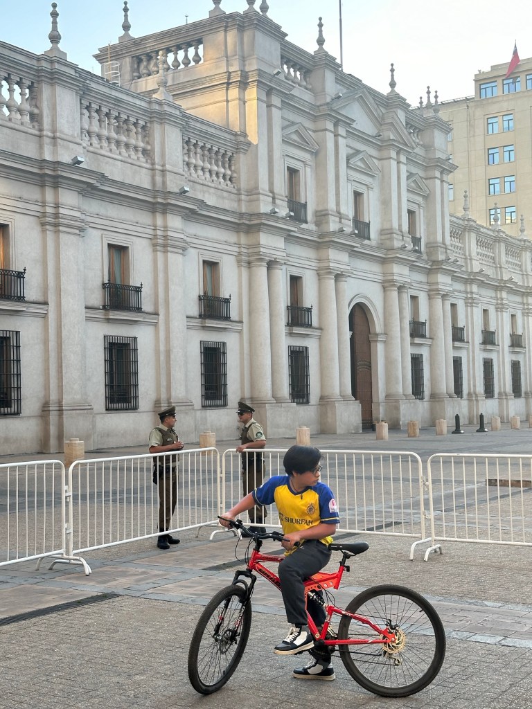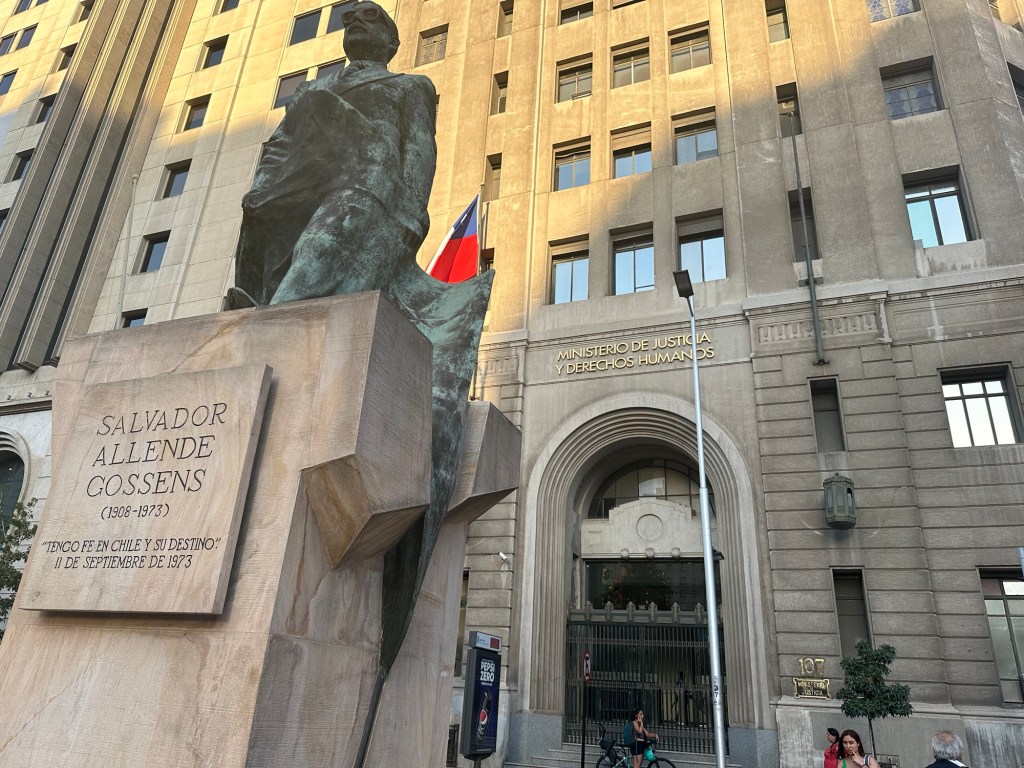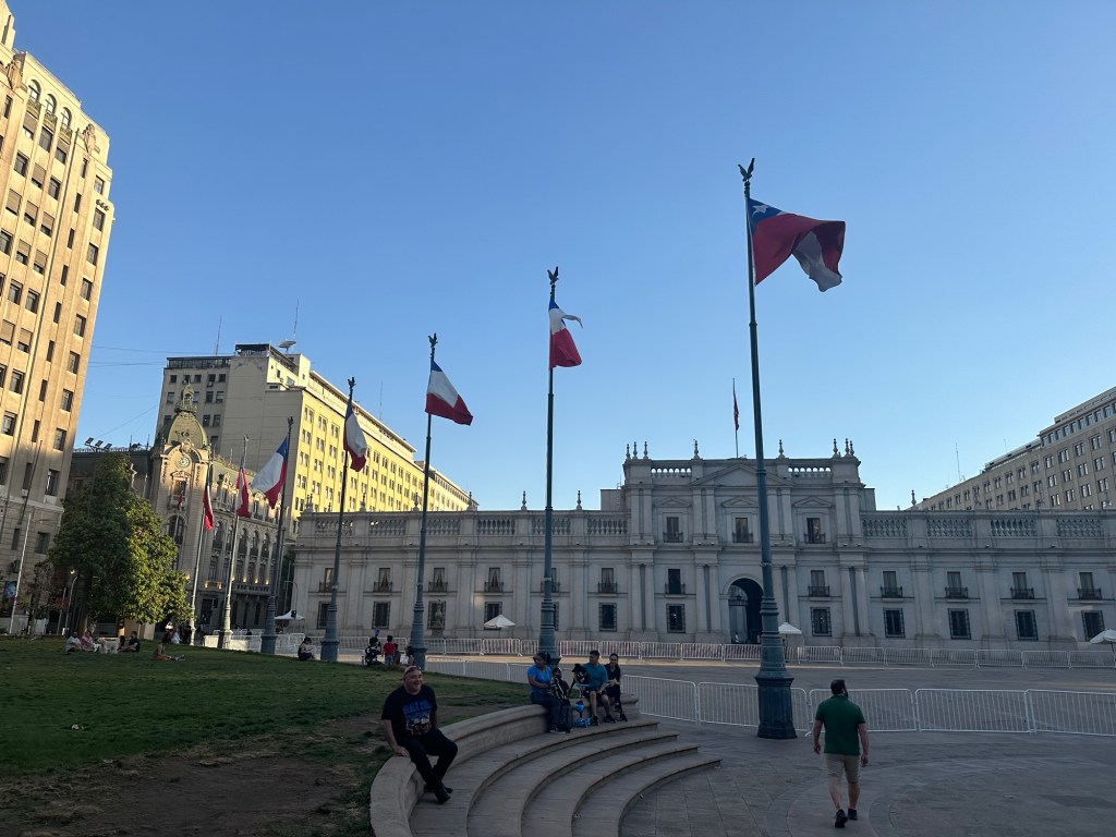 Mit dem Auto fahren wir anschliessend ins Regierungsviertel, auf Wunsch von Claudia (…). Hier geht es weniger lebendig zu und her. Das Regierungsgebäude ist weiträumig abgesperrt. Überall Überwachungsleute. Auf dem Park tummeln sich einige Menschen und Hunde herum. Im Hintergrund hören wir, dass in der Nähe protestiert wird. Wir entdecken die Statue von Salvador Allende, dem Regierungspräsidenten, der 1973 vom Militär gestürzt worden ist …
