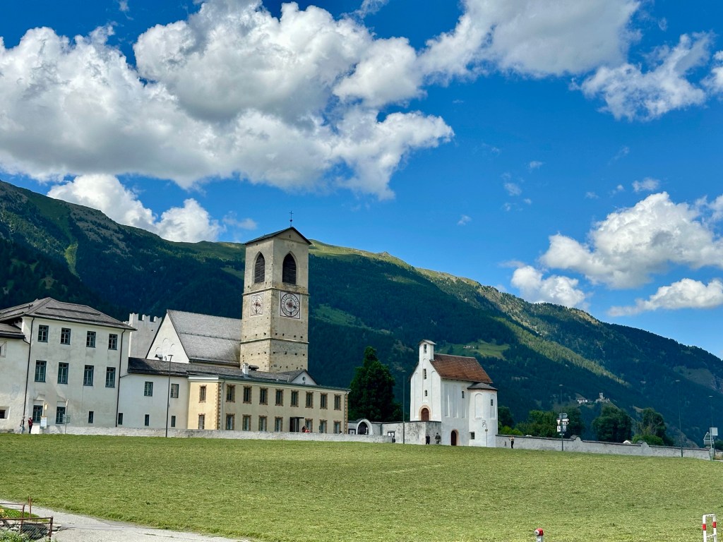 Nach einen Ruhetag mit Besuch des berühmten UNESCO-Klosters St. Johann in Müstair starteen wir vor sechs Uhr Richtung Prado. Wir sind fast alleine unterwegs, ohne Frühstück, denn alles ist noch geschlossen. In Prado verstärken wir uns mit dem ersten Getreidesportriegel und Wasser aus unserer Velotasche. Dann geht es den Pass hinauf, immer noch fast alleine. Wir hören Murmeltiere rufen und einmal sehen wir sogar einen Adler. Wir fahren am Hotel von Gustav Thöni, dem einstigen Dominator des Skiweltcups, vorbei. Nach und nach wird die Berglandschaft karger und die berühmten Kehren beginnen. Es sind 48, alle nummeriert.