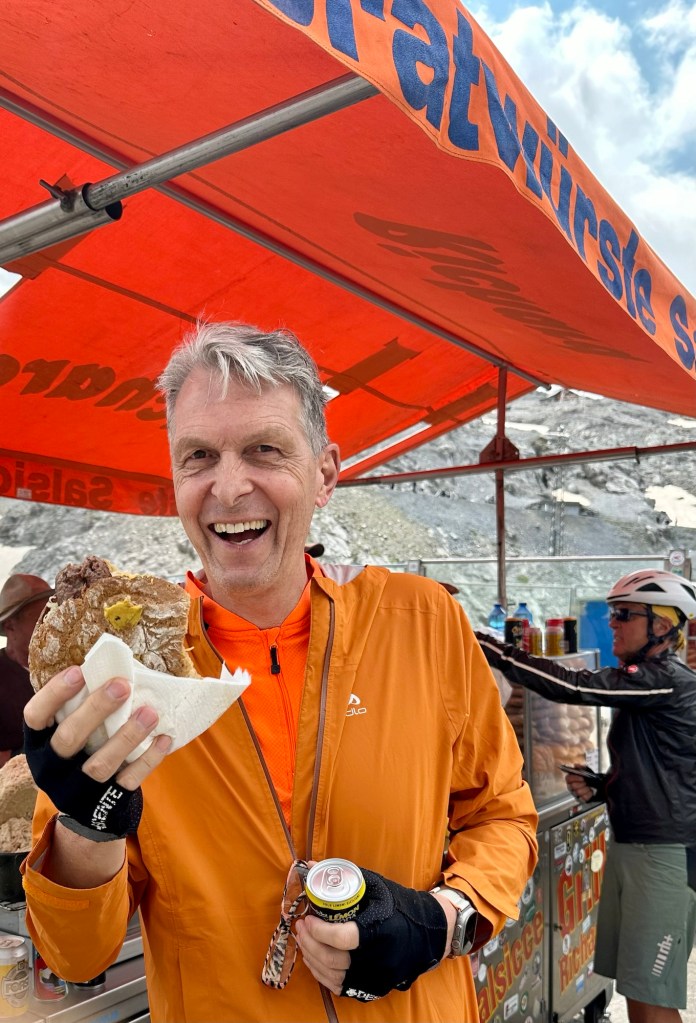Auf dem Pass ist ein wahres Volksfest im Gang. Stefan genehmigt sich eine Hirschbratwurst mit Senf, Kraut und Brot.