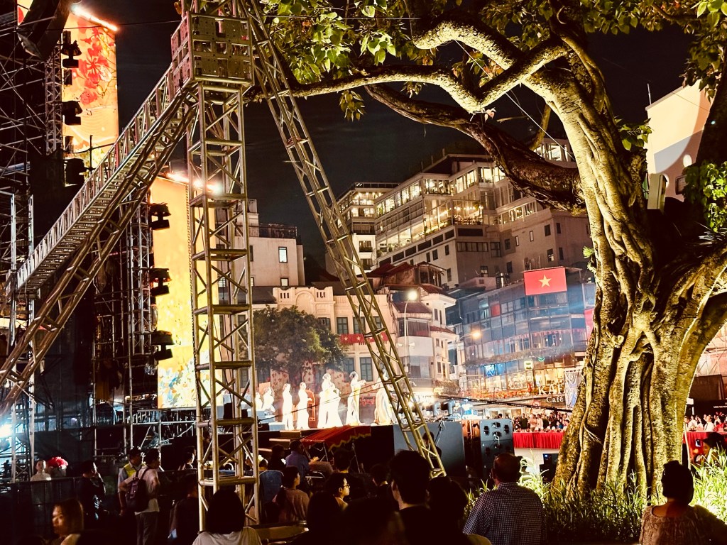 Das Essen im Restaurant, das wir ausgewählt hatten, war ausgezeichnet. Typisch vietnamesische Küche und zum Dessert genossen wir den berühmten Kaffee mit Kokos. Etwas süss, aber fein. 😋 Zum Abschluss gab es eine musicalähnliche Bühnenshow am See, die – fast – 😉 alle genossen.