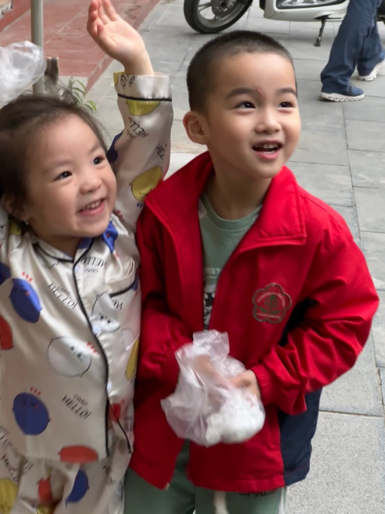 Auf dem Weg zurück zum Fluss, wo nun das Leben erwacht war, hörten wir auf einmal vor einem kleinen Tempel vietnamesische Musik und sahen eine Menschenansammlung. Vom Innern des Gebäudes wurden 1000 Dong-Geldscheine (3 Rappen) hinausgeworfen.