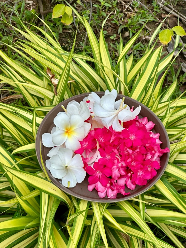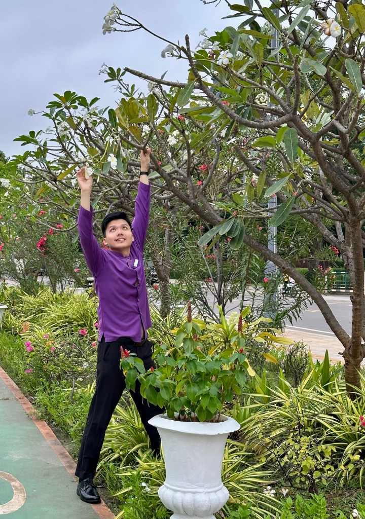 Die Jasminblüte ist eine wichtige Blume. Unter anderem wird daraus feiner Tee produziert. Auf der Joggingrunde gestern hat ein Hotelangestellter u.a. Jasminblüten gesammelt.