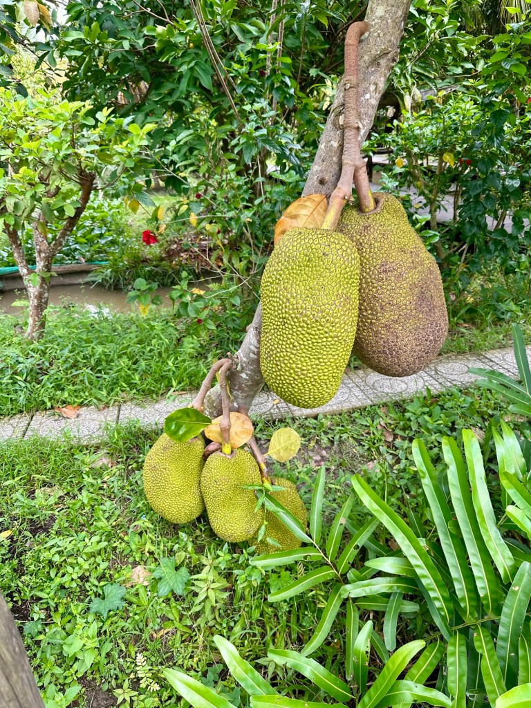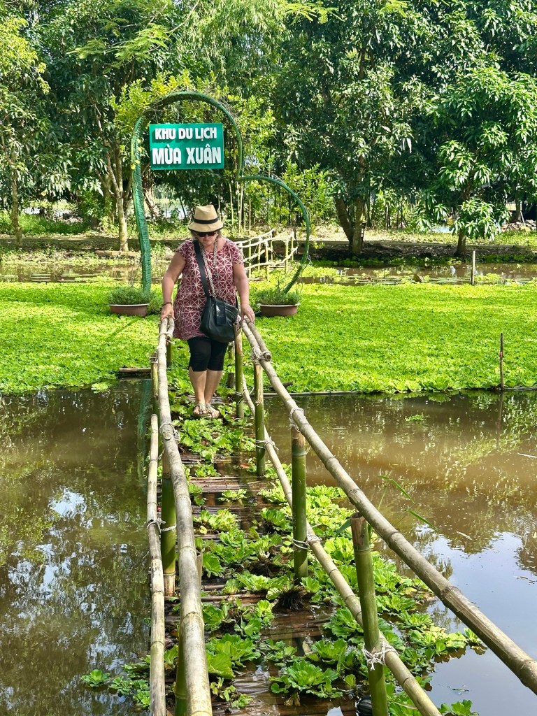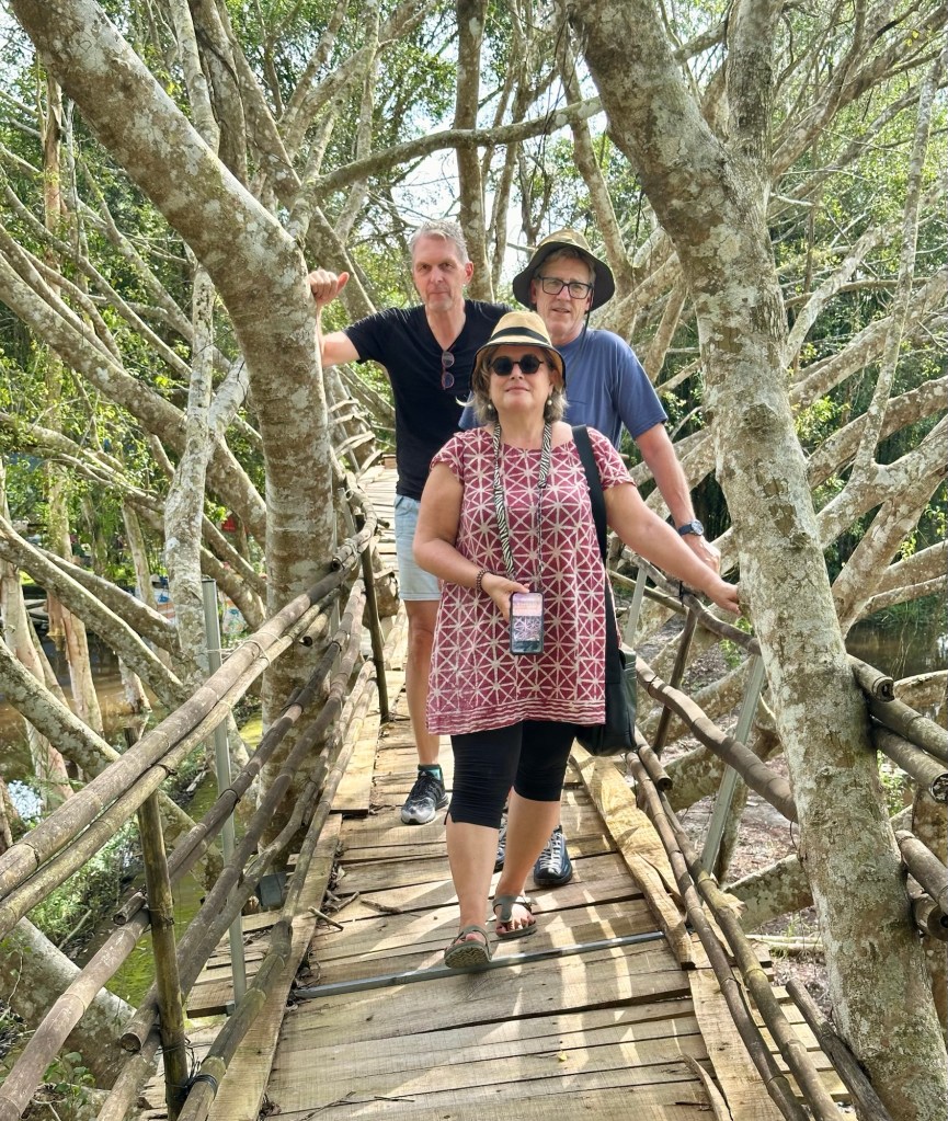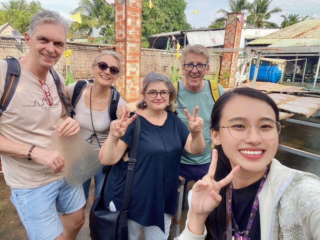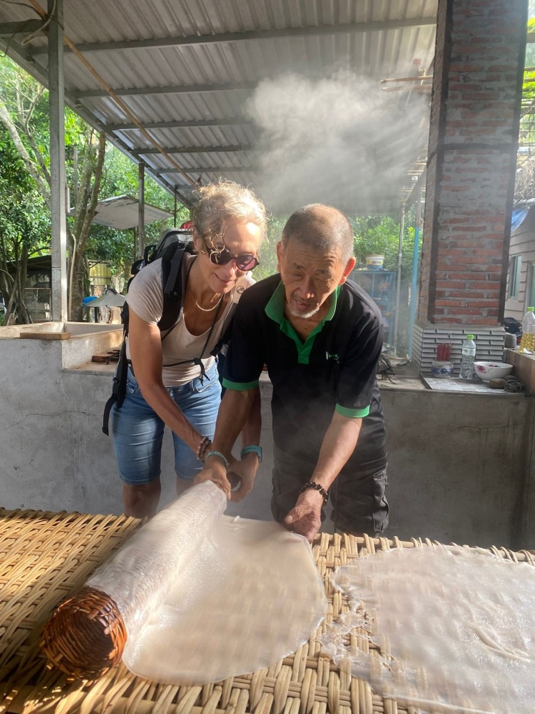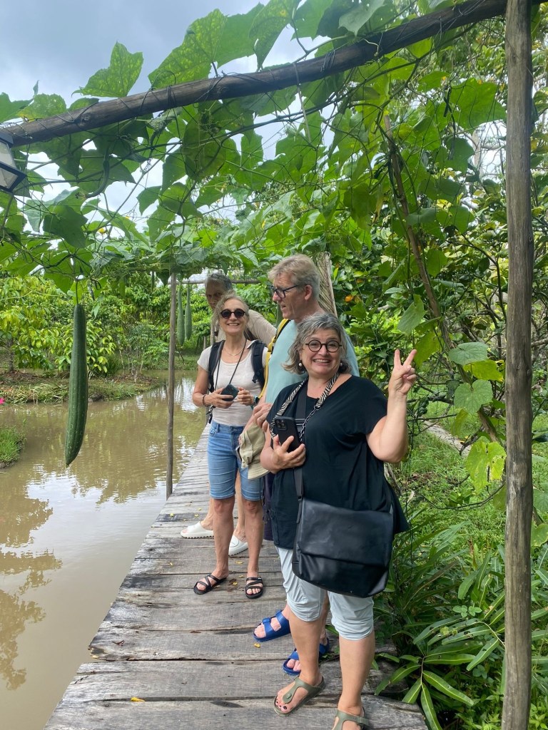 Der Ausflug war verbunden mit einem interessanten Besuch einer Obstplantage, bei einer vierköpfigen Familie, die auf drei aneinander festgemachten Schiffen wohnt, sowie eines „Workshops“ zur Reisnudelherstellung.