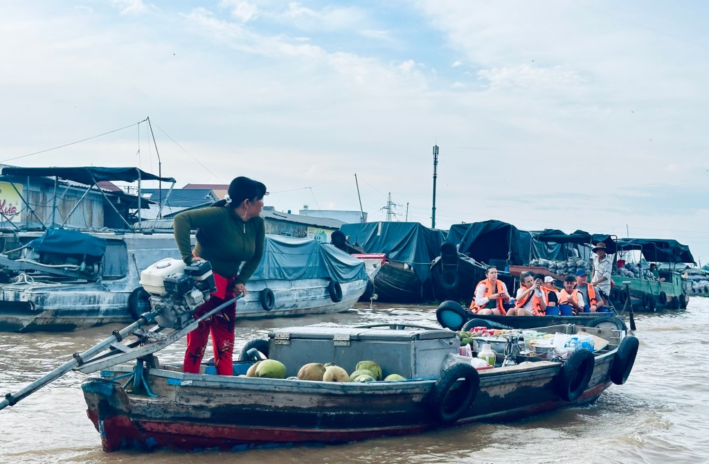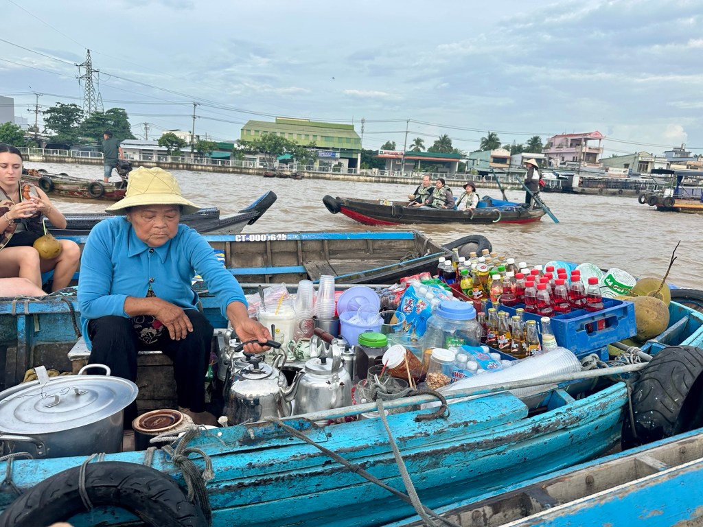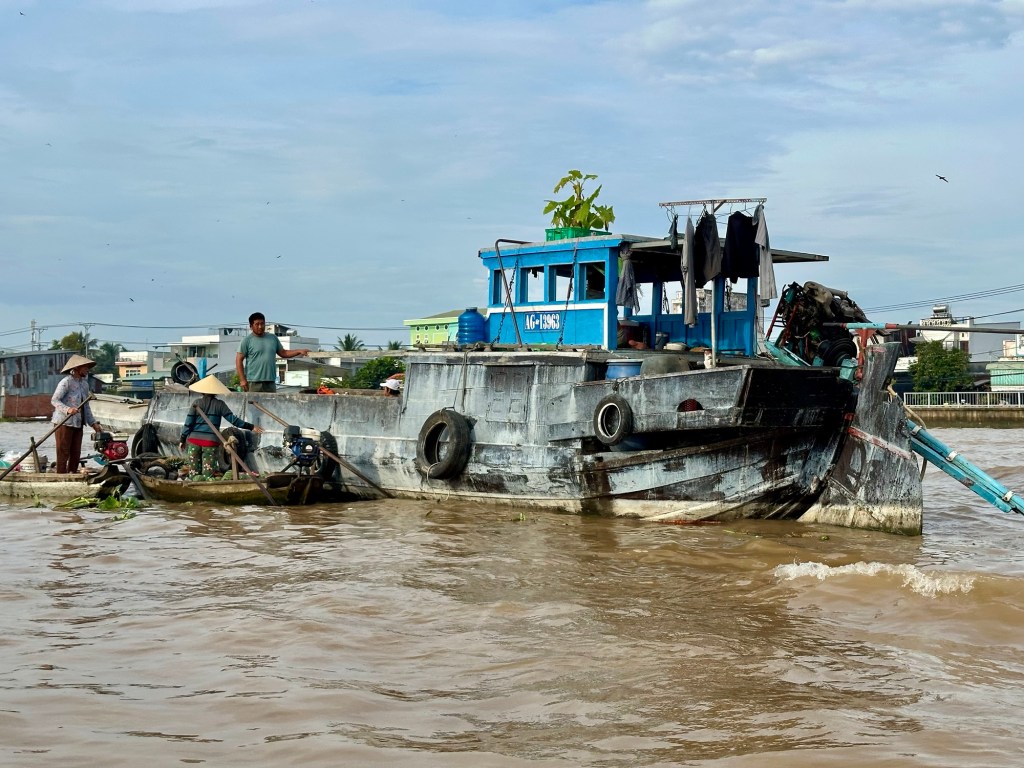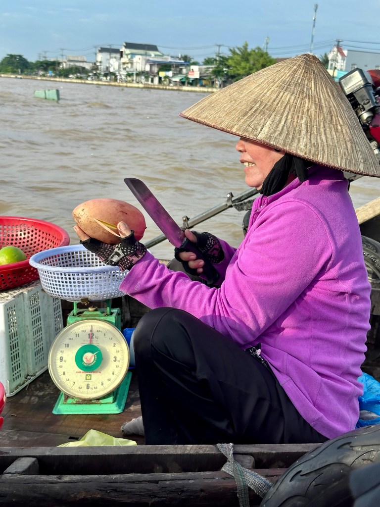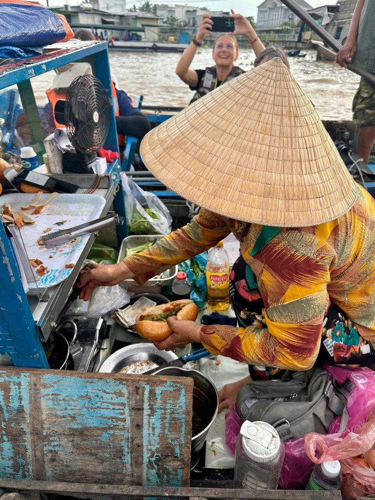 Unterwegs erklärte man uns, dass es früher praktisch in jedem Ort einen schwimmenden Markt gab, doch sei heute Cai Rang noch der einzig übriggebliebene. Wir merkten rasch: Dieser findet nur noch wegen den Tourist/innen statt.