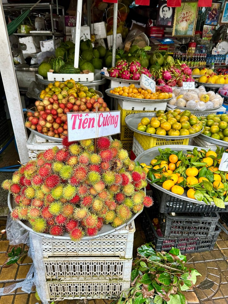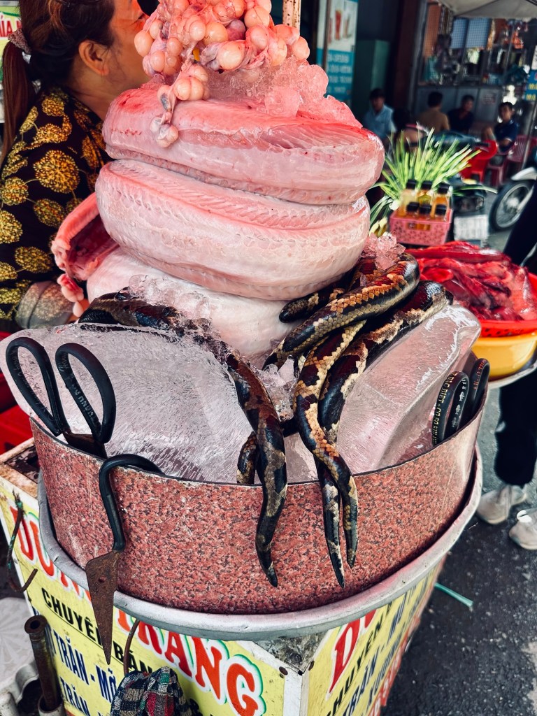 Ein Highlight war hingegen der Ausflug in den Nationalpark Lung Ngoc. Unsere dynamische Guide Ngoc holte uns kurz vor Mittag ab. Die Taxifahrt dauerte für die 45 Kilometer rund eine Stunde. Wir machten einen Zwischenhalt bei einem lokalen Markt auf dem Land. Was wir zu sehen bekamen, war spannend: Eine riesige Vielfalt an Früchten und Gemüsen, ein für unsere Augen Wirrwarr an Alltagsprodukten und viele Stände mit Geflügel, Fleisch, Fisch und Amphibien. Die Tiere, zum Teil noch halblebendig, waren in engsten Gehäusen eingepfercht. Auch das ist Vietnam …