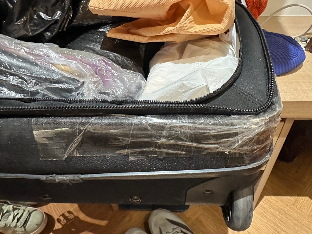 PS2. Claudias Koffer, gekauft vor der Marokkoreise, hat arg gelitten. Zur Sicherheit hat sie den kleinen Riss mit einem breiten Band, das sie an der Hotelreception erhalten hat, überklebt.